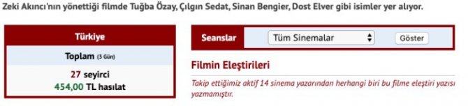 Yusuf Atıcı ve Zeki Akıncı’nın yönettiği, komedi filmi 3 Ocak cuma günü vizyona girdi. Film açılış hafta sonunda 27 kişi tarafından izlendi.