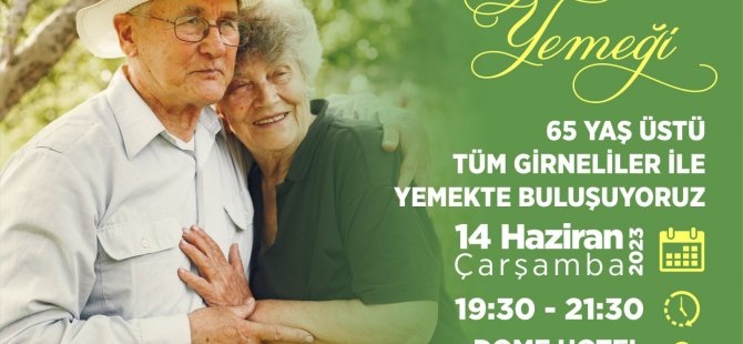 Girne Belediyesi İkinci Bahar Programı kapsamında yemek düzenliyor. Girne bölge sınırları içerisinde ikamet eden tüm 65 yaş üstü bireylerin davetli olduğu yemek, 14 Haziran Çarşamba günü, Dome Hotel havuz başında düzenleniyor. Girne Belediyesi Sosyal İşler Amirliği’nden yapılan açıklamaya göre saat 19:30 – 21:30 arasında düzenlenecek olan yemeğe katılmak isteyen bireylerin, en geç 10 Haziran tarihine kadar 0542 880 21 17 veya 0392 815 14 94 numaralı telefonlara bilgi vermeleri gerektiği açıklandı.