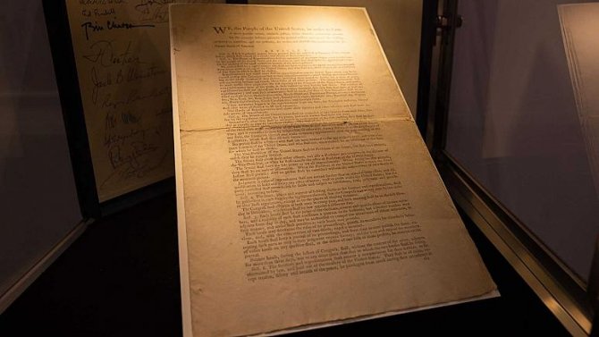 George Washington, Benjamin Franklin ve James Madison da dahil olmak üzere 'Amerika'nın kurucuları' tarafından 17 Eylül 1787'de Philadelphia'nın Bağımsızlık Salonunda imzalanan ve ertesi yıl onaylanan ABD anayasasının 11 kopyası bulunuyor.