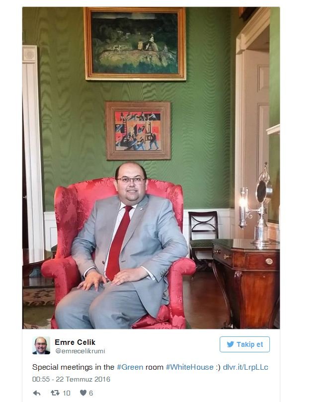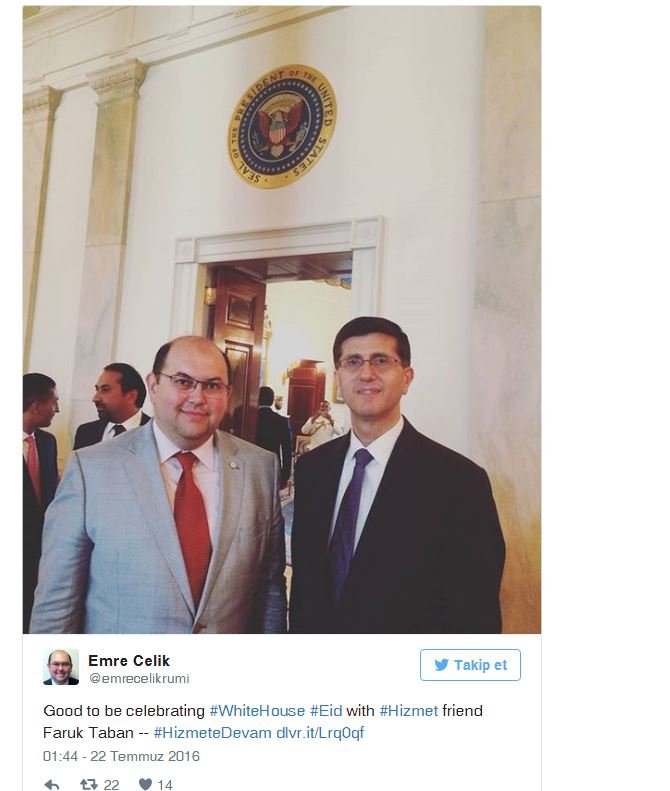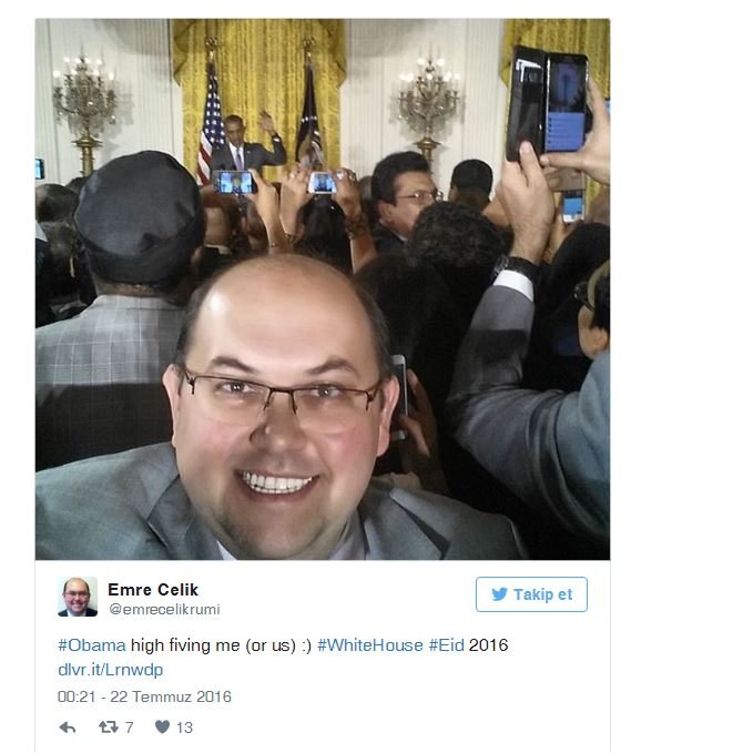 ABD'de faaliyet gösteren Rumi Forum'un başkanı Emre Çelik, resepsiyonda çektiği selfie'yi sosyal medya hesaplarında paylaştı.