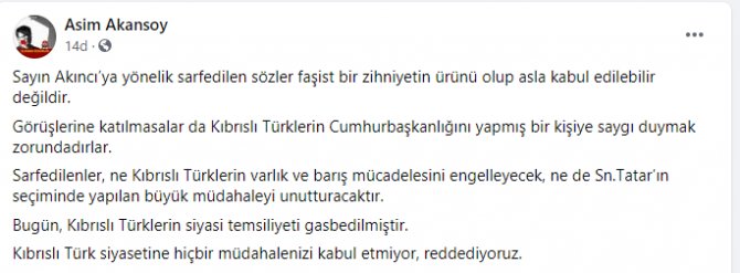 Sayın Akıncı’ya yönelik sarfedilen sözler faşist bir zihniyetin ürünü olup asla kabul edilebilir değildir.