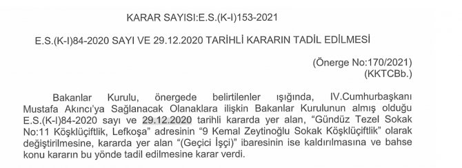 4.Cumhurbaşkanı Mustafa Akıncı’nın talebi doğrultusunda Lefkoşa-Köşklüçiftlik'te ofis verildiği Resmi Gazete’de yayımlandı.