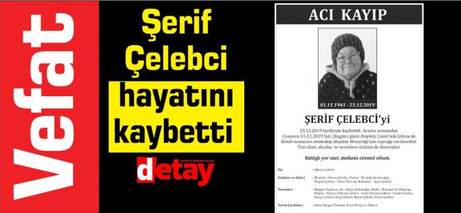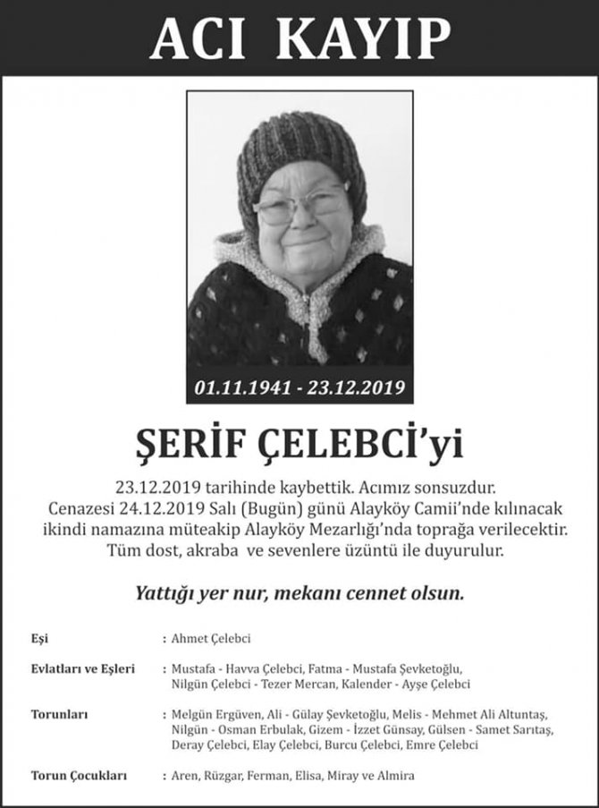 78 yaşındaki Çelebci’nin cenazesi 24 Aralık Salı Günün Alayköy Cami’nde kılınacak ikindi namazı sonrası Alayköy Mezarlığı’nda toprağa verilecek