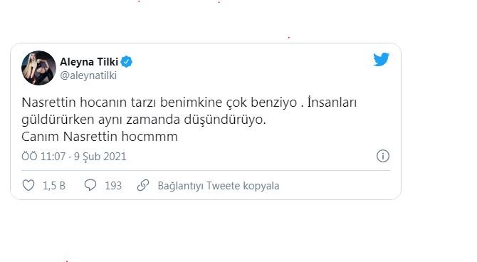 Şarkıcı Aleyna Tilki, kişisel Twitter hesabında yaptığı paylaşımda, "Nasreddin Hoca'nın tarzı benimkine çok benziyor. İnsanları güldürürken aynı zamanda düşündürüyor. Canım Nasreddin Hocam" ifadesini kullandı.