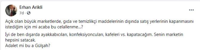''Açık olan büyük marketlerde, gıda ve temizlikçi maddelerinin dışında satış yerlerinin kapanmasını istediğim için mi acaba bu celallenme...?