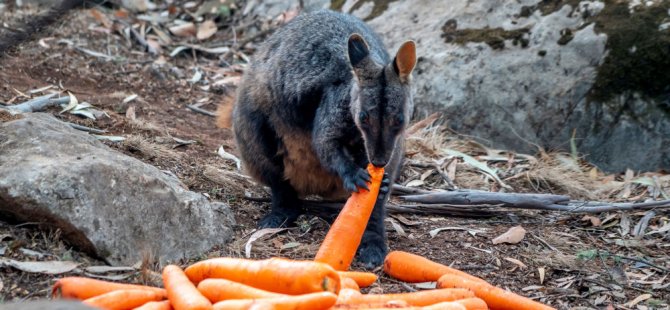 Geçen hafta Kaya Valabisi Operasyonu (Operation Rock Wallaby) kapsamında çeşitli valabi sürüleri için havadan binlerce kilo tatlı patates, havuç ve ot atıldı.