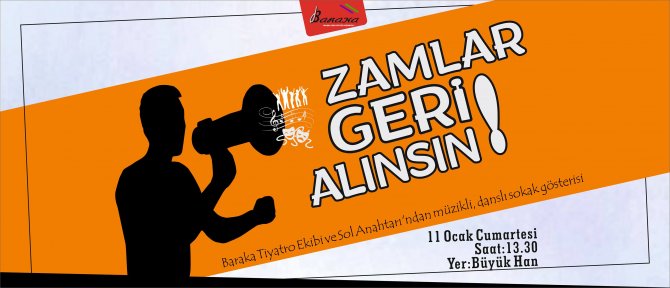 Zamların geri alınması için sözümüz, müziğimiz ve dansımızla zamları protesto ediyoruz. Baraka Tiyatro Ekibi ve Sol Anahtarı'nın “Zamazingo Kantosu” eşliğinde, müzikli, danslı, sokak gösterisi gerçekleştireceği bu protesto Büyük Han’da gerçekleşecektir.