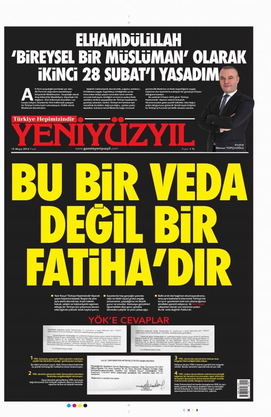 Gazete bugün çıkan son sayısında "Bu bir veda değil bir Fatiha'dır" manşeti ve gazetenin sahibi Mansur Toğpçuoğlu'nun "Elhamdulillah 'bireysel bir' müslüman' olarak ikinci 28 Şubat'ı yaşadım" sürmanşeti ile okurlarına veda etti.