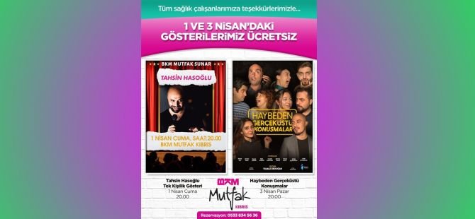 BKM Mutfak Kıbrıs, pandemi sürecinin bütün yükünü omuzlayan sağlık çalışanları için, komedyen Tahsin Hasoğlu Stand up gösterisi ve “Haybeden Gerçeküstü Konuşmalar” oyununu sağlık çalışanları için ücretsiz sergileyecek.