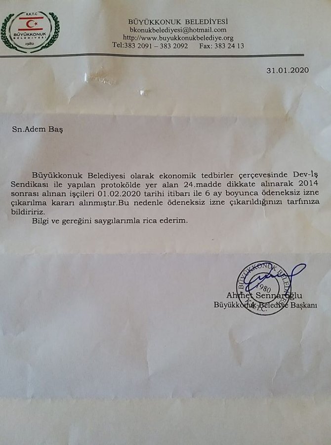 Büyükkonuk Belediyesi Başkanı Ahmet Sennaroğlu’nun 14 işçiyi 6 ay ödeneksiz izne yollandığı öğrenildi.