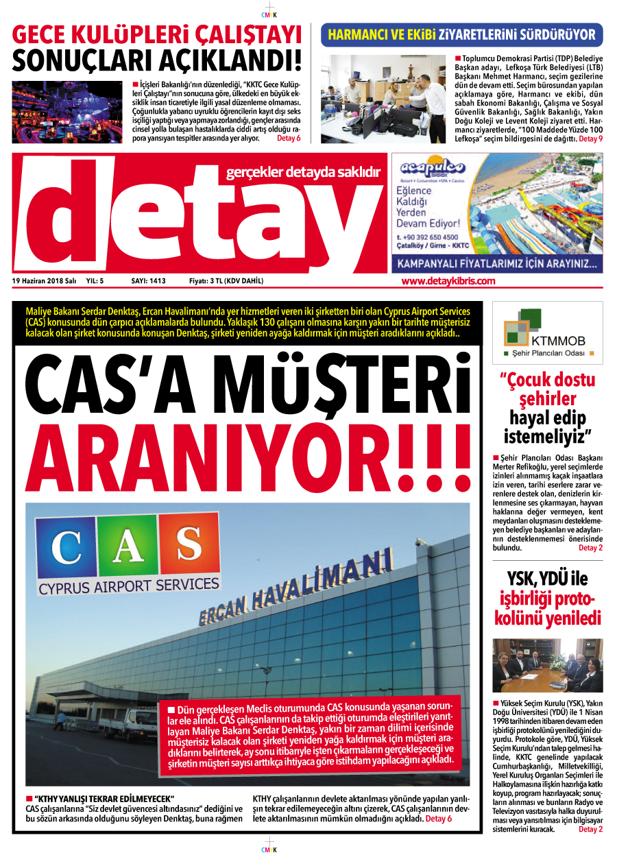 Maliye Bakanı Serdar Denktaş, Ercan Havalimanı’nda yer hizmetleri veren iki şirketten biri olan Cyprus Airport Services (CAS) konusunda dün çarpıcı açıklamalarda bulundu. Yaklaşık 130 çalışanı olmasına karşın yakın bir tarihte müşterisiz kalacak olan şirket konusunda konuşan Denktaş, şirketi yeniden ayağa kaldırmak için müşteri aradıklarını açıkladı..