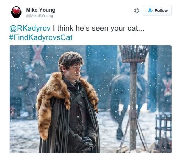 BBC'nin sosyal medyada çok paylaşılan mesajları derlediği BBC Trending programı, Çeçenistan lideri Ramazan Kadirov'un kaybettiği kedisi için fotoğraf paylaşım uygulaması Instagram'da ilan vermesi üzerine alay konusu olmasını haber yaptı.