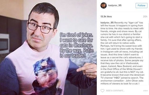 BBC'nin sosyal medyada çok paylaşılan mesajları derlediği BBC Trending programı, Çeçenistan lideri Ramazan Kadirov'un kaybettiği kedisi için fotoğraf paylaşım uygulaması Instagram'da ilan vermesi üzerine alay konusu olmasını haber yaptı.