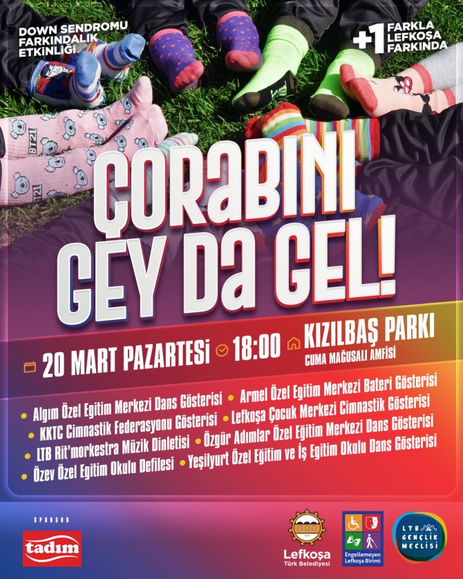 Lefkoşa Türk Belediyesi’nin “+1Farkla Lefkoşa Farkında” sloganı ile Dünya Down Sendromu Günü’nde geleneksel olarak düzenlediği “Çorabını Gey da Gel” etkinliği 20 Mart Pazartesi günü saat 18.00’de Kızılbaş Parkı’nda yapılıyor.