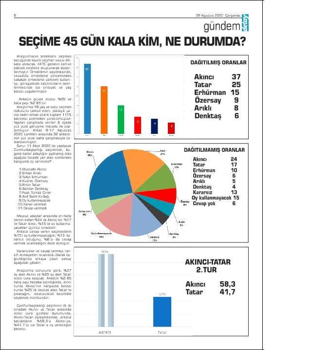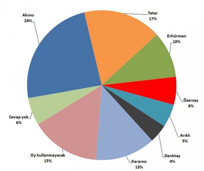 Mevcut adaylar arasında en fazla tercih edilen %24 ile Akıncı’dır. %17 ile Tatar ikinci; %15 ile oy kullanmayacaklar üçüncü sıradadır.
