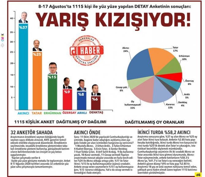 Araştırma sonucuna göre, %37 oy alan Akıncı ve %25 oy alan Tatar ikinci tura kalacak.