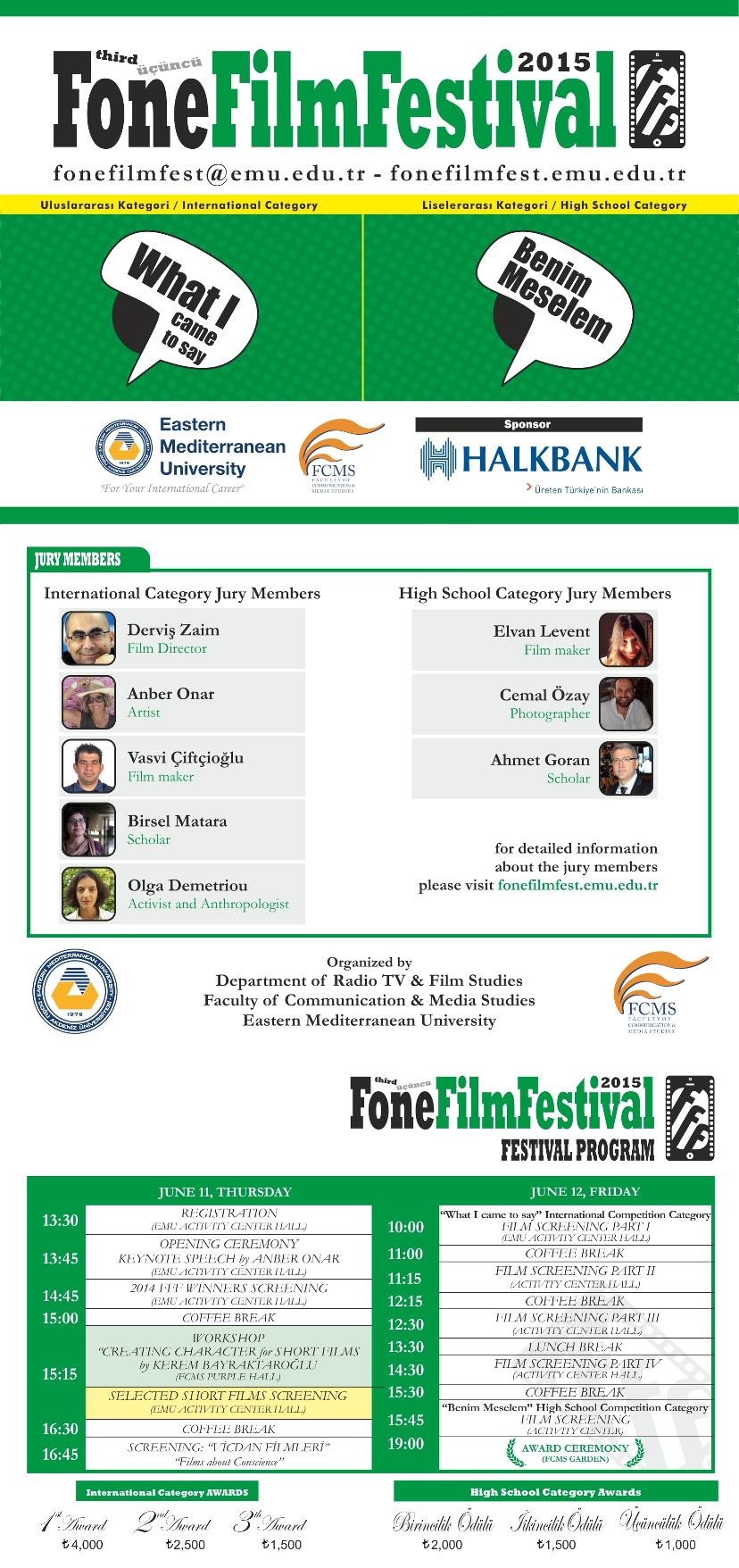 Doğu Akdeniz Üniversitesi İletişim Fakültesi Radyo, TV, Sinema ve Gazetecilik Bölümü tarafından bu yıl üçüncüsü düzenlenen Fone Film Festivali yarın başlıyor.