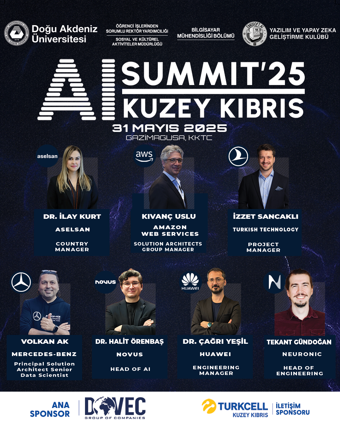Doğu Akdeniz Üniversitesi (DAÜ), bilimsel gelişmeleri destekleyen vizyoner yaklaşımı doğrultusunda, 31 Mayıs 2025 Cumartesi günü, 10.00 – 18.30 saatleri arasında, Rauf Raif Denktaş Kültür ve Kongre Sarayı’nda düzenlenecek olan Yapay Zekâ Zirvesi’25’te (AI Summit’25) bilim ve teknoloji liderlerini gençlerle buluşturmaya hazırlanıyor. DAÜ Sosyal ve Kültürel Aktiviteler Müdürlüğü ile DAÜ Yazılım ve Yapay Zekâ Geliştirme Kulübü iş birliğinde, DAÜ Bilgisayar Mühendisliği Bölümü katkılarıyla, Döveç Group of Companies ana sponsorluğu ve Kuzey Kıbrıs Turkcell’in iletişim sponsorluğunda düzenlenecek olan zirve ile ilgili DAÜ Rektörü Prof. Dr. Hasan Kılıç açıklamalarda bulunarak bilime ve teknolojiye ilgisi olan herkesi etkinliğe davet etti. Yapılan açıklamalarda şu ifadelere yer verildi:
