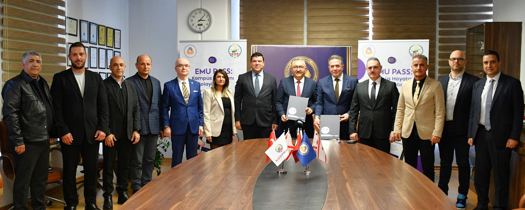 Doğu Akdeniz Üniversitesi (DAÜ) ve Kıbrıs Türk Kooperatif Merkez Bankası (Koopbank) arasında Üniversitedeki öğrenci ve çalışanlara, finansal ve diğer alanlardaki işlemlerini dijital olarak yapabilecekleri EMU PASS isimli mobil uygulamanın sağlanması amacıyla sözleşme imzalandı. Söz konusu sözleşmeye DAÜ Rektörü Prof. Dr. Hasan Kılıç, Koopbank Yönetim Kurulu Başkanı Haluk Yerli ve Koopbank Genel Müdürü Kemal Ataman imza koydu. İmza töreninde DAÜ Vakıf Yöneticiler Kurulu (VYK) Başkanı Dr. Erdal Özcenk, DAÜ Rektör Yardımcıları Prof. Dr. Osman M. Karatepe, Prof. Dr. Sonuç Zorlu, Prof. Dr. Salih Katırcıoğlu, DAÜ Genel Sekreter Vekili Derviş Ekşici, DAÜ Bilgi Teknojileri Müdürü Aytaç Çerkez, DAÜ Ulaşım İşleri Şube Amiri Aykut Türkmaya ve Koopbank’tan gelen heyet hazır bulundu.