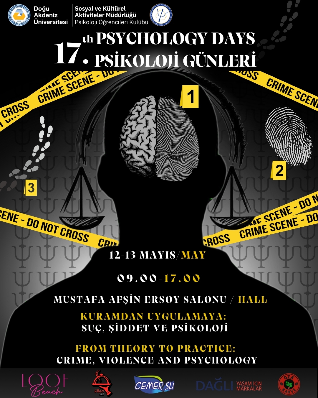 Doğu Akdeniz Üniversitesi (DAÜ) Psikoloji Öğrencileri Kulübü tarafından düzenlenecek olan 17. Psikoloji Günleri bu yıl “Kuramdan Uygulamaya: Suç, Şiddet ve Psikoloji” teması ile 12-13 Mayıs 2025 tarihleri arasında Mustafa Afşin Ersoy Salonu’nda hem Türkçe hem İngilizce dillerinde gerçekleştirilecek.
