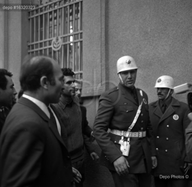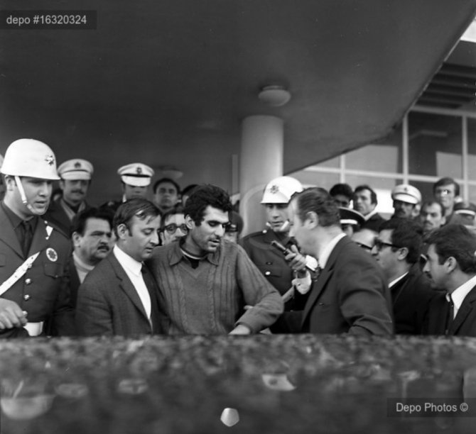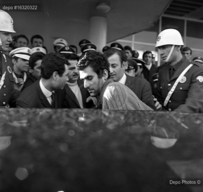 Depo Photos arşivindeki bu fotoğrafları ilk kez yayınlıyoruz... Deniz Gezmiş, Ankara Emniyet Müdürlüğü'ndeki sorgusu sonrası güvenlik çemberi içinde adliyeye götürülüyor, 18 Mart 1971. (Erol Olgundemir - Depo Photos)