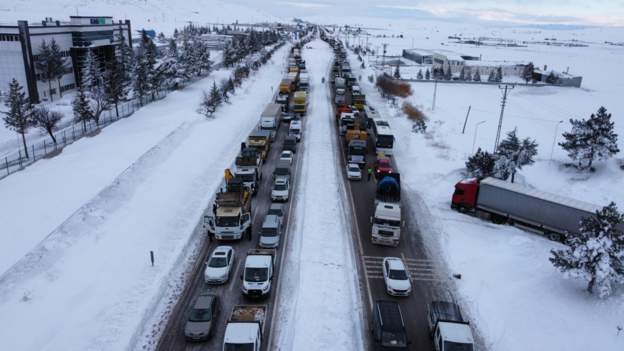 Konya Sarayönü'nden bildiren DHA, deprem bölgesine giden araçların 10 kilometrelik kuyruk oluşturduğu yolun dronla çekilmiş görüntülerini paylaştı
