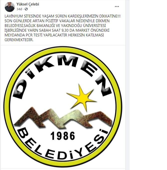 "Lavinyum sitesinde yaşam süren kardeşlerimizin dikkatine! Son günlerde artan pozitif vakalar nedeniyle Dikmen Belediyesi, Sağlık Bakanlığı ve Yakın Doğu Üniversitesi iş birliğinde yarın sabah saat 09.30'da market önündeki meydanda PCR testi yapılacaktır. Herkesin katılması gerekmektedir."