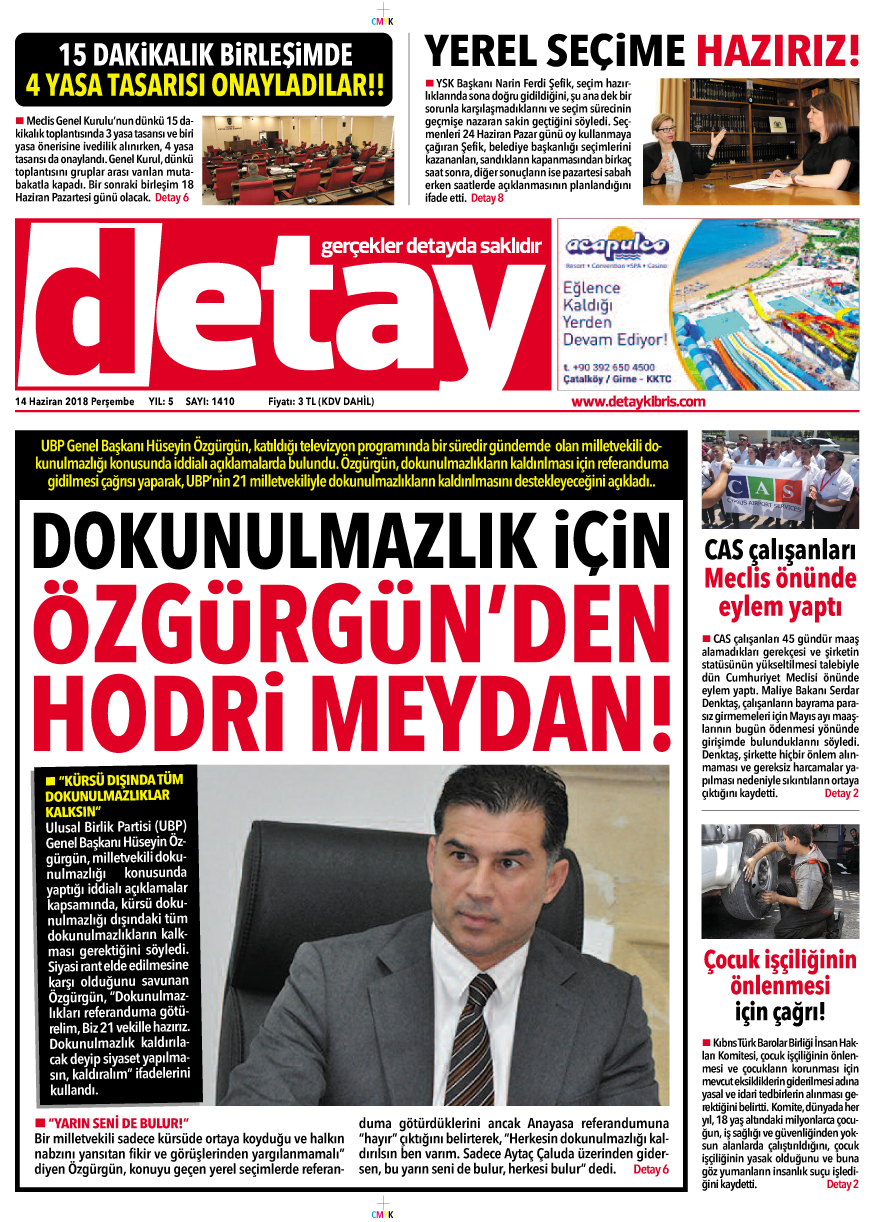 UBP Genel Başkanı Hüseyin Özgürgün, katıldığı televizyon programında bir süredir gündemde olan milletvekili dokunulmazlığı konusunda iddialı açıklamalarda bulundu. Özgürgün, dokunulmazlıkların kaldırılması için referanduma gidilmesi çağrısı yaparak, UBP’nin 21 milletvekiliyle dokunulmazlıkların kaldırılmasını destekleyeceğini açıkladı..