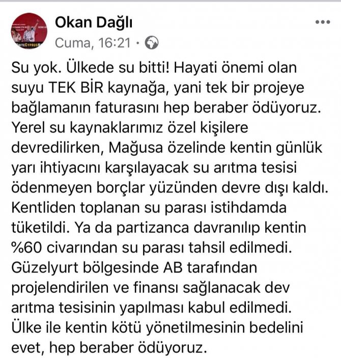 Yerel su kaynaklarımız özel kişilere devredilirken, Mağusa özelinde kentin günlük yarı ihtiyacını karşılayacak su arıtma tesisi ödenmeyen borçlar yüzünden devre dışı kaldı. Kentliden toplanan su parası istihdamda tüketildi. Ya da partizanca davranılıp kentin %60 civarından su parası tahsil edilmedi. Güzelyurt bölgesinde AB tarafından projelendirilen ve finansı sağlanacak dev arıtma tesisinin yapılması kabul edilmedi. Ülke ile kentin kötü yönetilmesinin bedelini evet, hep beraber ödüyoruz.