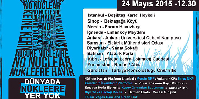24 Mayıs Pazar, 12.30’da eş zamanlı olarak İstanbul, Mersin, Sinop,Ankara, İğneada, Samsun, Batman, Diyarbakır, Kıbrıs, Yunanistan, Gürcistan’da Akdeniz ve Karadeniz’i tehdit eden yapılması planlanan veya Metsamor gibi yapılmış olan nükleer santrallere karşı ses çıkarıyoruz.