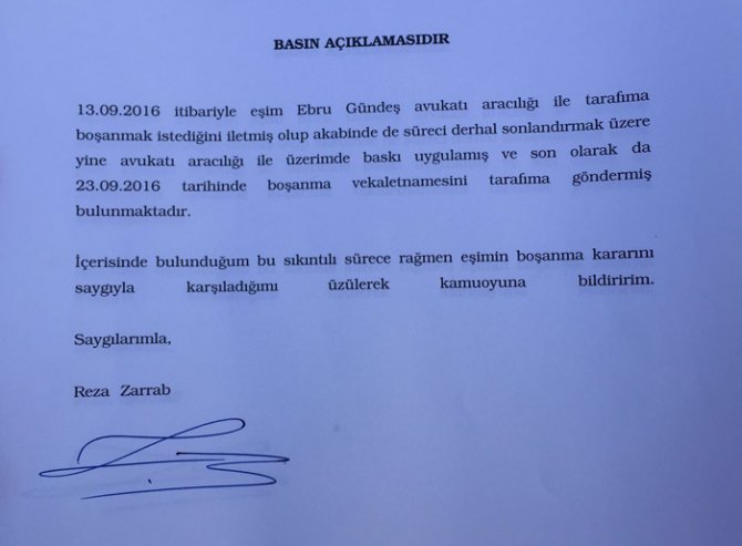 Halen ABD'de tutuklu bulunan Reza Zarrab avukatları aracılığı ile yaptığı açıklamada Ebru Gündeş ile boşanacağını açıkladı. Zarrab boşanma teklifinin Ebru Gündeş'ten geldiğini ve kendisinin de bu teklifi içinde bulunduğu güç koşullara rağmen kabul ettiğini açıkladı.