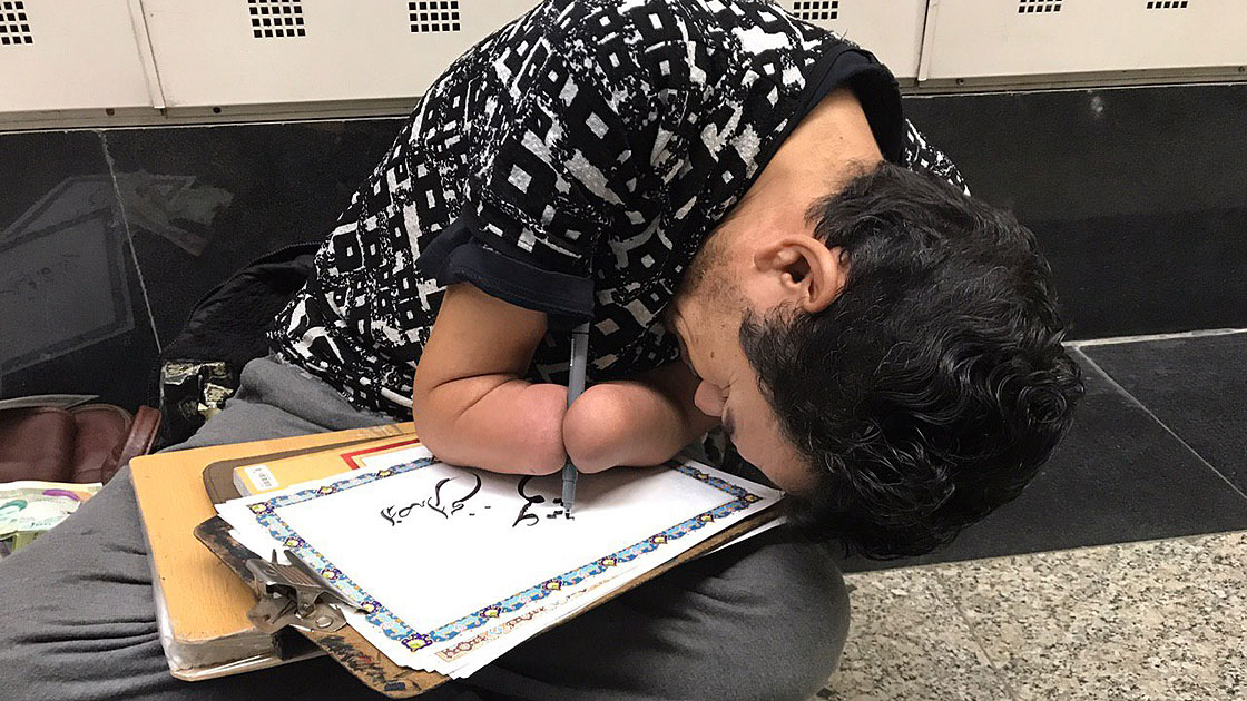 İranlı Şehram Ahmedi, 15 yaşında geçirdiği kaza sonucu ellerini kaybetmesine rağmen hayata tutunmaktan vazgeçmedi ve 25 yaşından sonra kollarıyla hat sanatı icra etmeye başladı.