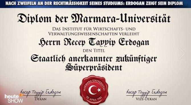 Diplomanın unvan kısmında, “Geleceğin sertifikalı süper başkanı” denilerek Erdoğan alaya alındı.