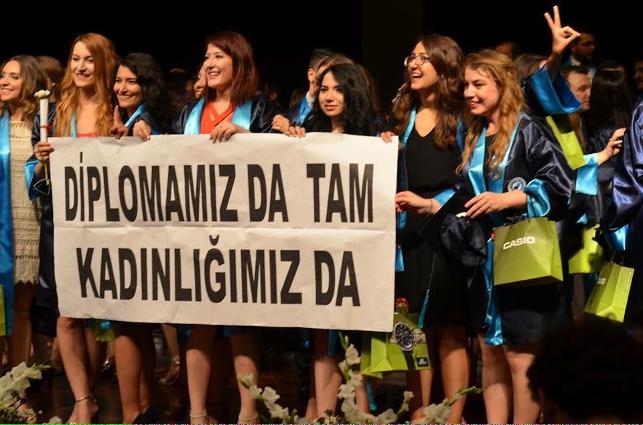 Cumhurbaşkanı Recep Tayyip Erdoğan'ın bir süre önce söylediği, 'Anneliği reddeden, evini çekip çevirmekten vazgeçen bir kadın, iş dünyasında istediği kadar başarılı olsun özgünlüğünü kaybetme tehlikesiyle karşı karşıyadır. Eksiktir, yarımdır' sözlerine Denizli Pamukkale Üniversitesi Tıp Fakültesi öğrencilerinden sert bir karşılık geldi. Mezun olan bir grup öğrenci, sahnede, 'Diplomamız da tam, kadınlığımız da' yazılı pankart açtı.Pamukkale Üniversitesi'nde mezuniyet törenleri bugün yapılan genel mezuniyet töreniyle sona erdi. Genel mezuniyet töreni saat 14.00'te yapılırken, Tıp Fakültesi mezuniyet töreni saat 11.00'de yapıldı. PAÜ Kültür ve Kongre Merkezi'nde yapılan törende öğrenciler sahnede keplerini atarak mezuniyet coşkusunu yaşadı. Törenin sonunda Tıp Fakültesi'nden mezun kadın öğrencilerden 10'u'