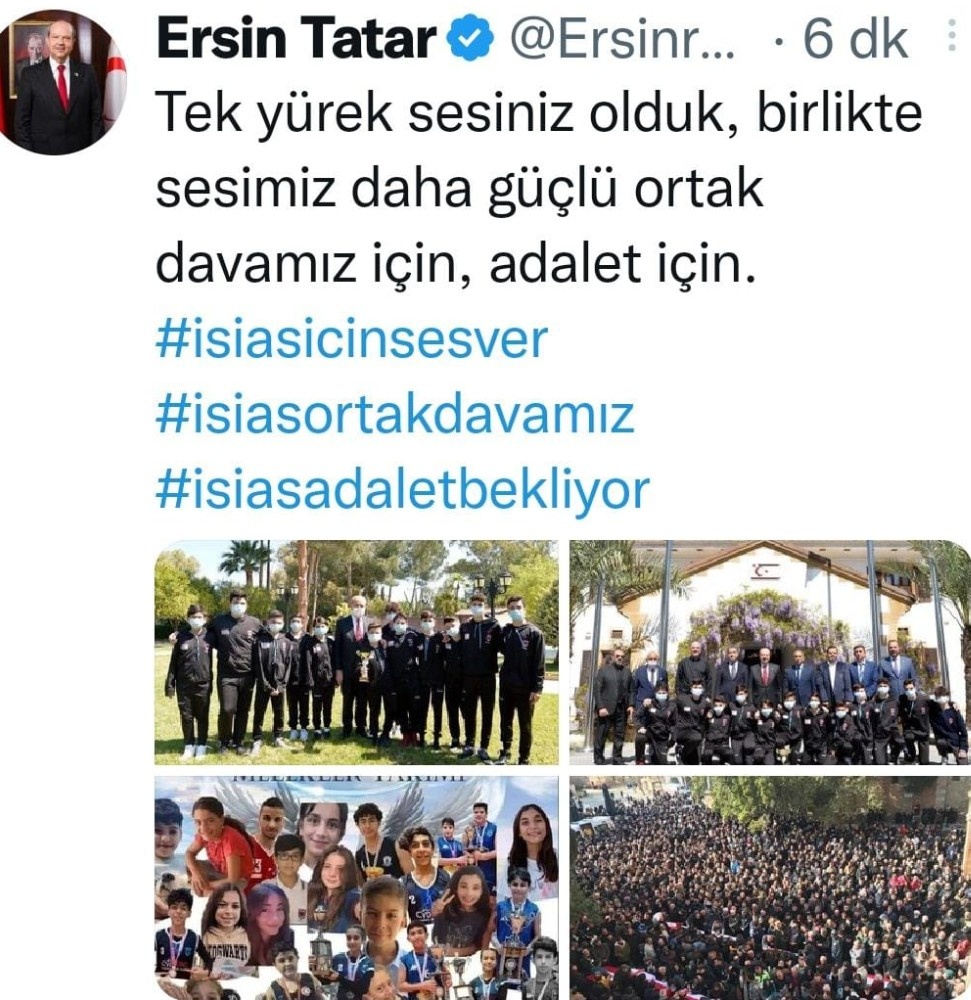Cumhurbaşkanı Ersin Tatar, her akşam Twitter'da İsias cinayetine karşı başlatılan hashtag'li paylaşımlarını bu akşamda sürdürdü.