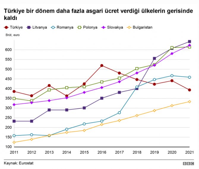 Türkiye'deki brüt asgari ücret euro cinsinden 2011'deki asgari ücret ile neredeyse aynı seviyede: 10 yılda yalnızca 8 euro artış gerçekleşti. AB üyeleri veya adayları içinde 10 yıl öncesine kıyasla yüzde 0,5'in altında artış yaşayan başka bir ülke yok.