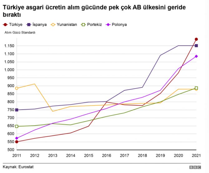 Dahası Türkiye 10 yıl öncesine kadar, bugün asgari ücrette gerisinde kaldığı pek çok AB ülkesinden yukardaydı.