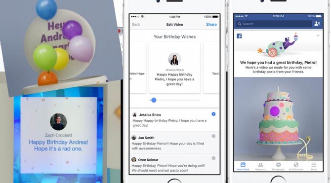 Facebook’tan çarpıcı bir yenilik daha geldi. Her gün 100 milyonun üzerinde doğum günü mesajı paylaşılan Facebook, kişiselleştirilmiş doğum günü videolarını kullanıma sundu. Facebook, doğum günü videoları ile insanların aile ve arkadaşlarının mesajlarını ve etiketlendikleri fotoğrafları bir araya getirerek kişiye ve güne özel bir video oluşturuyor.