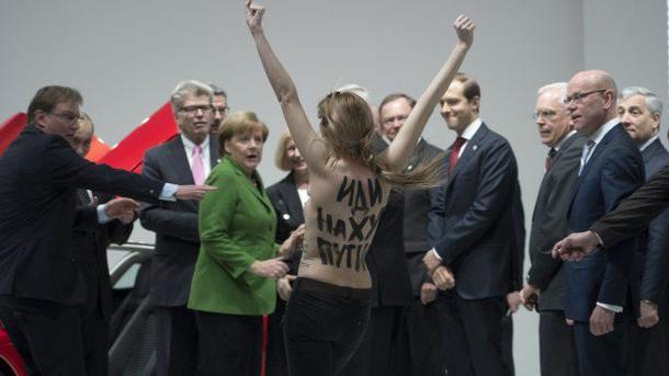 Üç FEMEN üyesine Tunus’ta hapis cezası verilmesini protesto eden dört kişilik grup Dünya Evi önünde tam Başbakan Angela Merkel kürsüye çıktığı sırada bir anda ortaya çıktı.