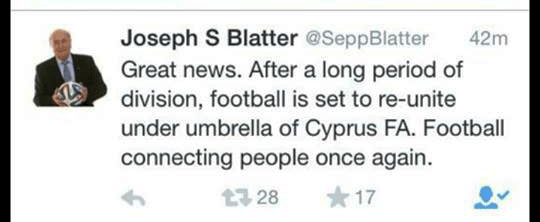 FİFA Başkanı Joseph S. Blatter sosyal medyadan yaptığı duyuruda Kıbrıs’ta futbolun birleşmesi için düğmeye basılmasını ‘Harika bir haber’ olarak değerlendirerek “Futbol bir kez daha insanları bir birine bağlıyor” ifadelerini kullandı.