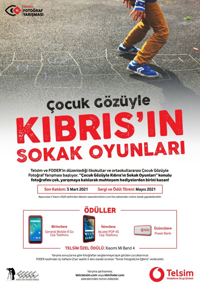 Telsim ve Kıbrıs Türk Fotoğraf Derneği(FODER) iş birliğiyle düzenlenen “Çocuk Gözüyle Kıbrıs’ın Sokak Oyunları” fotoğraf yarışması devam ediyor. Covid-19 salgını nedeni ie ertelenen yarışma için başvurulara, 2 Kasım 2020’de tekrar başladı. Yarışmaya son katılım tarihi ise 5 Mart 2021. Başvurular, www.kktctelsim.com/kss adresinden online olarak yapılabiliyor.