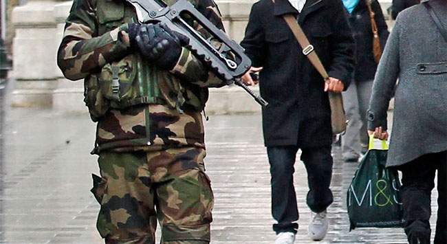 Paris'in büyük alış veriş merkezlerinde ve metro istasyonlarında, polisin yanı sıra yaklaşık 450 Fransız askeri görev yapıyor.