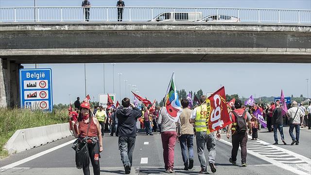 Fransa'daki yeni çalışma yasa tasarısının geri çekilmesini talep edien Fransız ve Belçikalı sendikacılar Belçika-Fransa sınında tasarıyı protesto etti.