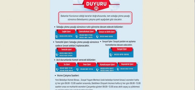 Buna göre özellikle cenaze, çöp toplama, ilaçlama, su işleri ve zabıta hizmetleri, devamlılığı açısından aşağıdaki şekilde yeniden düzenlenmiştir: