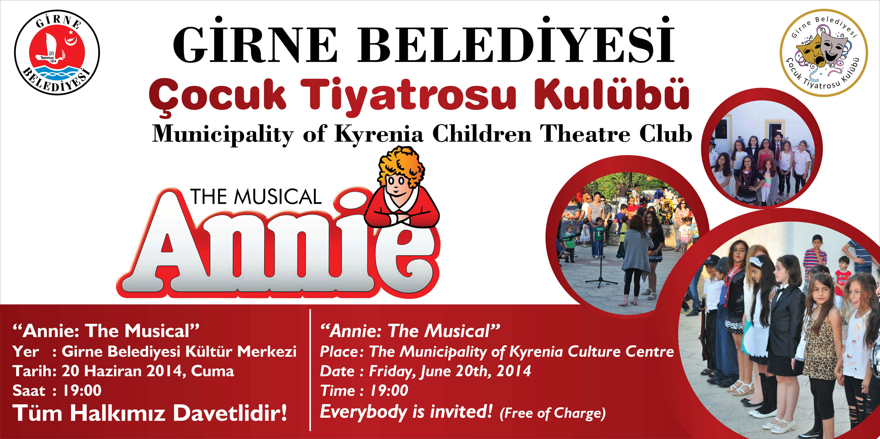 Girne Belediyesi Çocuk Tiyatrosu Kulübü, bugün saat 19.00’da, Girne Belediyesi Kültür Merkezi’nde “Annie: The Musical” adlı oyunu sergileyecek. Girne Belediyesi’nden yapılan yazılı açıklamaya göre, ücretsiz sergilenecek oyun, kızlar yetimhanesinde kalan, anne babasını bulma arayışında kaçırılmaya çalışılan ve sonuçta çok zengin bir adam tarafından evlat edinilen Annie’nin hikâyesini anlatıyor.