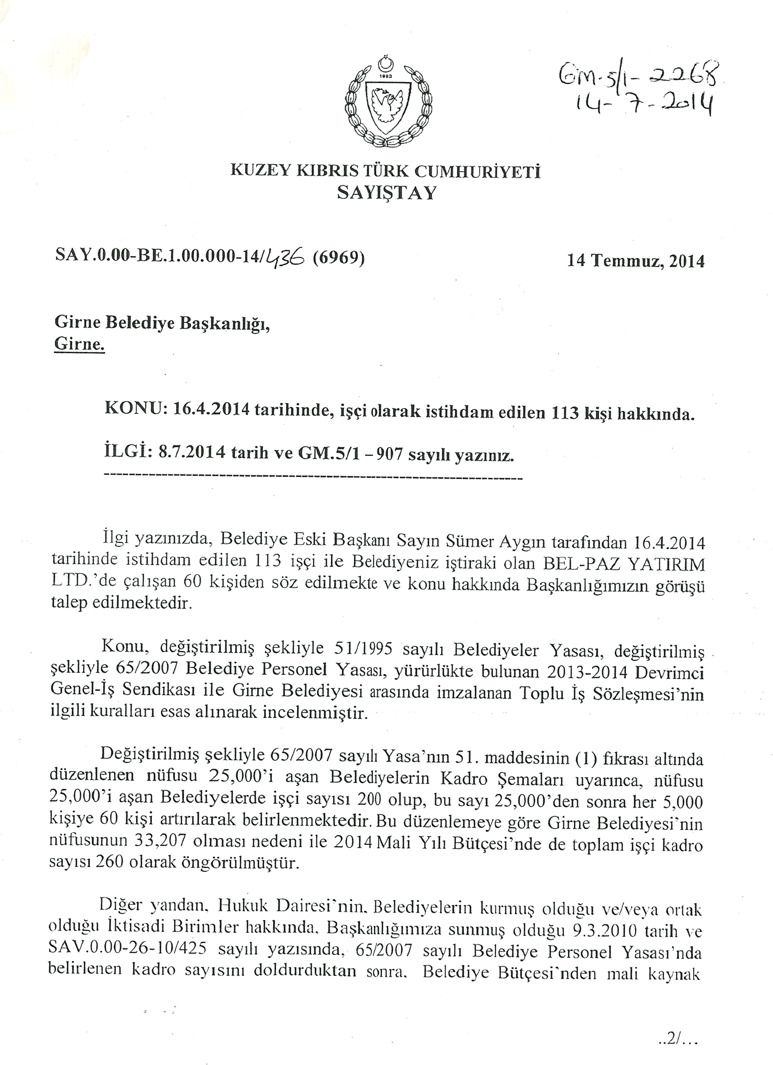 Güngördü, “2007 yılında geçen Personel Yasası’na göre, belediyelerde işçi ve memur ayrımı yapıldı ve nüfus esası vardır. Girne Belediyesi’nin nüfusu 30 Bin ise, (33 bindir ama Yasa kusuratlar dikkate alınmaz der) belediye işçi kadrosunda 260 personel çalıştırabilir. Hâlbuki Girne Belediyesi’nde 312 personel var. 52 personel fazlası olduğunu, 14 Temmuz günü Sayıştaylık tespit etti. Ben bu mektubu Sayıştaylık’tan alınca, hiçkimseyi aramadan ilk önce sendikayı aradım. ‘Bu konuda hep birlikte bir şey yapalım. Bu personelin atılmasını istemiyorum’ dedim. Hâlbuki dışarıda tam tersi söylendi. ‘Nidai geldi ve bu 52 kişiyi atmak için formül arar’ dendi. Bunu tamamen reddediyorum. Sayıştay Başkanı, Başsavcılık ve İçişleri Bakanı ile 2-3 kez görüştüm. İçişleri Bakanı bu konuya duyarlılık gösterdi, kendisine teşekkür ederim. Ancak Sayıştay Raporu’nda hala önümüzde 52 fazla işçi durmaktadır. İçişleri Bakanlığı’nın görüşü farklıdır. Dolayısıyla bunlar benim için önemli konular ve benim büyük bir zamanımı almaktadır” dedi.