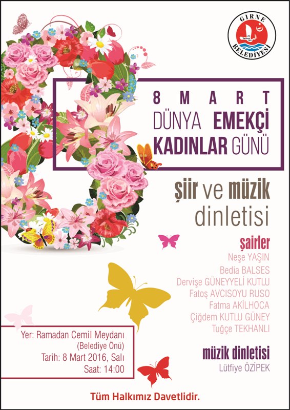 Girne Belediyesi 8 Mart Dünya Emekçi Kadınlar Günü nedeniyle 8 Mart 2016 Salı günü Ramadan Cemil Meydanı’nda saat 14:00’te şiir ve müzik dinletisi düzenliyor. Girne Belediyesi’nden verilen bilgide, ülkemizin değerli kadın şairlerinden Neşe Yaşın, Fatoş Avcısoyu Ruso, Çiğdem Kutlu Güney, Bedia Balses, Fatma Akilhoca, Dervişe Güneyyeli Kutlu, Tuğçe Tekhanlı’nın şiir dinletisinin yer alacağı etkinlikte, Lütfiye Özipek’in müzik dinletisi sunacağı belirtildi. Girne Belediye Başkanı Nidai Güngördü, toplumumuzda önemli bir yere sahip kadın şair ve sanatçılarımızla gerçekleştirilecek etkinlikte, sanatın evrensel diliyle 8 Mart Dünya Emekçi Kadınlar Günü’nde farklı bir anma ve kutlama gerçekleştirileceğini kaydetti.