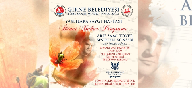 Şef İhsan Gürel yönetimindeki Girne Belediyesi Türk Sanat Müziği Topluluğu (TSM)  18 - 24 Mart Yaşlılar Haftası kapsamında, 20 Mart tarihinde ( bu akşam ) konser gerçekleştiriyor. Girne Amerikan Üniversitesi Spectrum Salonu’nda gerçekleştirilecek olan konser,  Türk bestekâr ve ses sanatçısı Arif Sami Toker bestelerinden oluşuyor. Girne Belediyesi Sosyal İşler Şubesi’nden yapılan açıklamaya göre 20 Mart Pazartesi gecesi saat 20.00’de başlayacak konsere tüm halkın davetli olduğu açıklandı.
