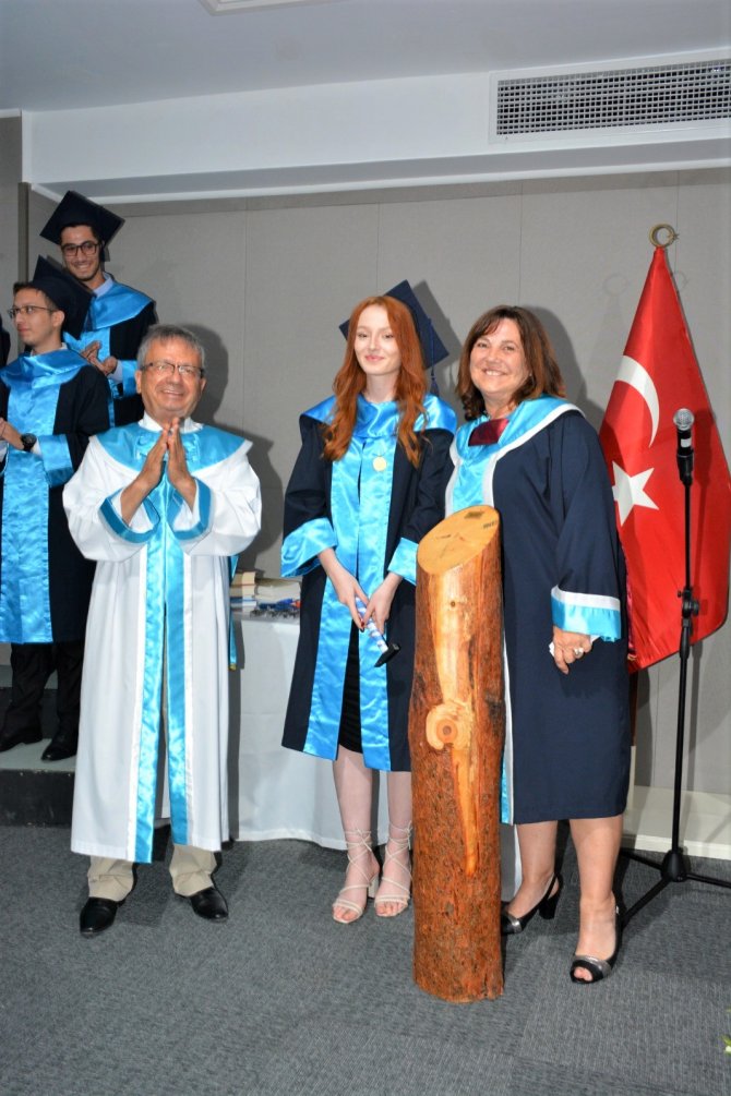 Dereceye giren mezunlara diploma ve madalyalarını alırken fakülte kütüğüne de plaketlerini çaktı. Mezun olan diğer öğrencilerin de diplomalarını aldığı tören, öğrencilerin hazırladığı renkli dans gösterisinin ve kep atma töreninin ardından mezuniyet pastasının kesilmesi ve düzenlenen kokteyl ile son buldu.