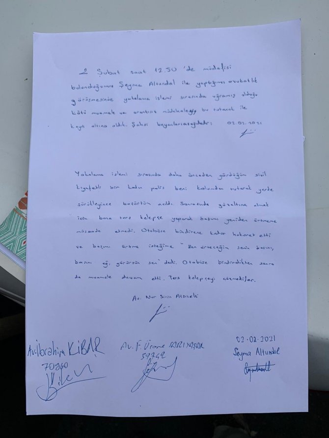 “Yakalama işlemi sırasında sivil kıyafetli bir kadın polis beni kolumdan tutarak yerde sürükleyince başörtüm açıldı. Sonrasında gözaltına almak için bana ters kelepçe yaparak başımı yeniden örtmeme müsaade etmedi. Başımı örtme isteğime ‘Ben örteceğim senin başını, başını öne eğ görürsün sen’ dedi. Otobüse bindikten sonra da muamele devam etti. Ters kelepçeyi çözmediler."